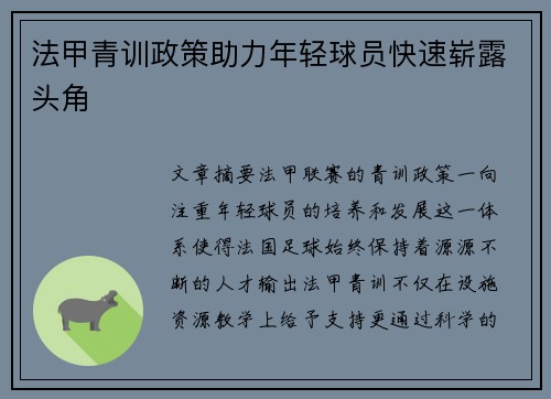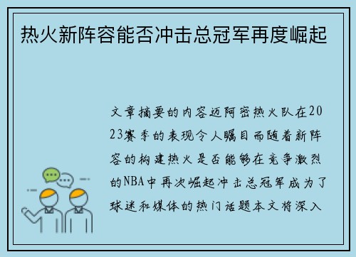 文章摘要:随着年轻球员的崭露头角,印第安纳步行者队逐渐展现出未来潜力。步行者的年轻阵容充满了活力与竞技潜力,球迷们对球队的新赛季充满期待。从球员的成长、战术体系的调整,到球队管理层的策略,步行者能否在新赛季实现质的飞跃,成为联盟的黑马,成为了大家讨论的焦点。本文将深入分析步行者年轻阵容的亮点与挑战,...